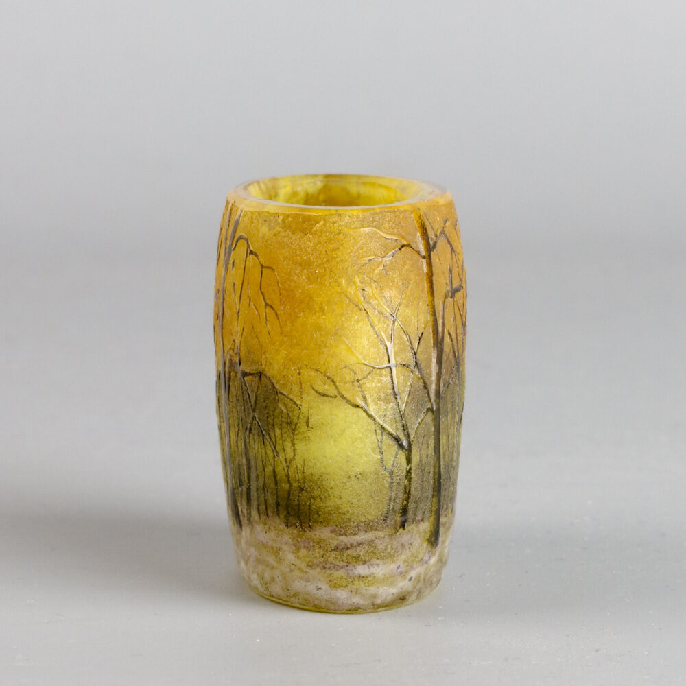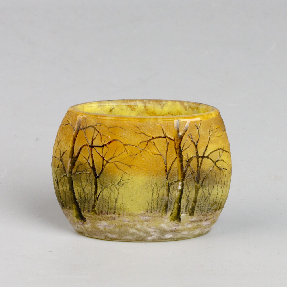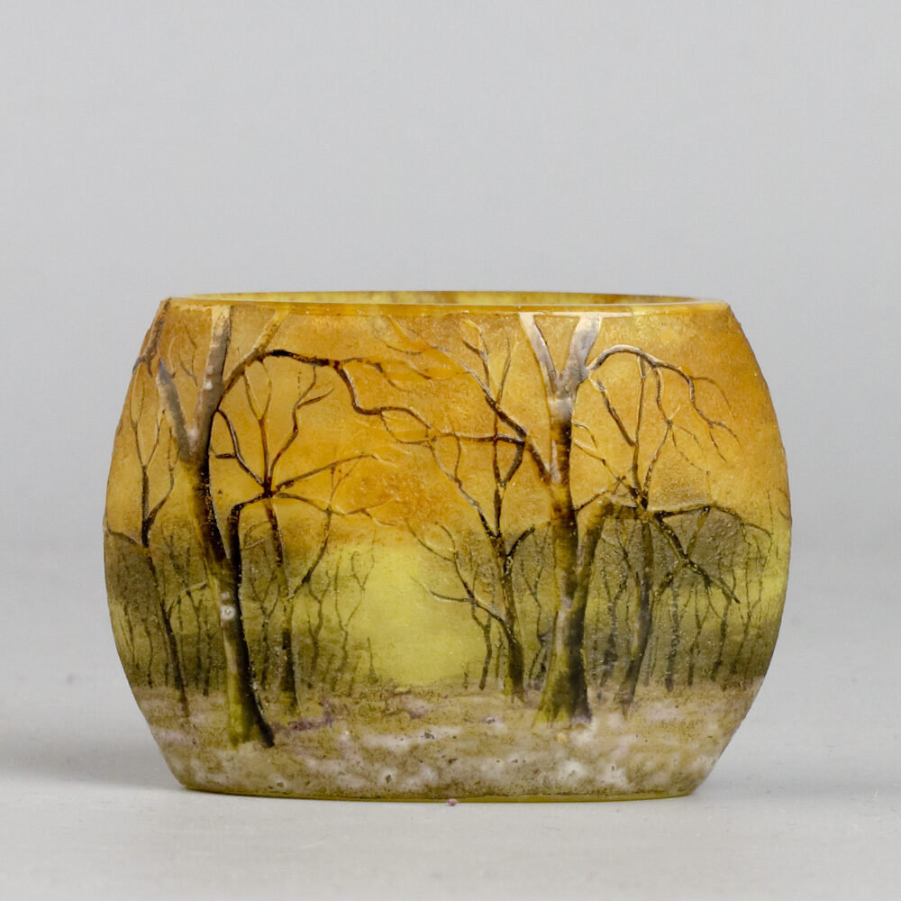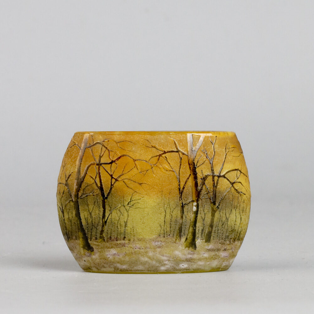 Miniatuur vaasje gemaakt bij Daum, Nancy rond 1905 met geëtste en geëmailleerd decor van een besneeuwd boslandschap.