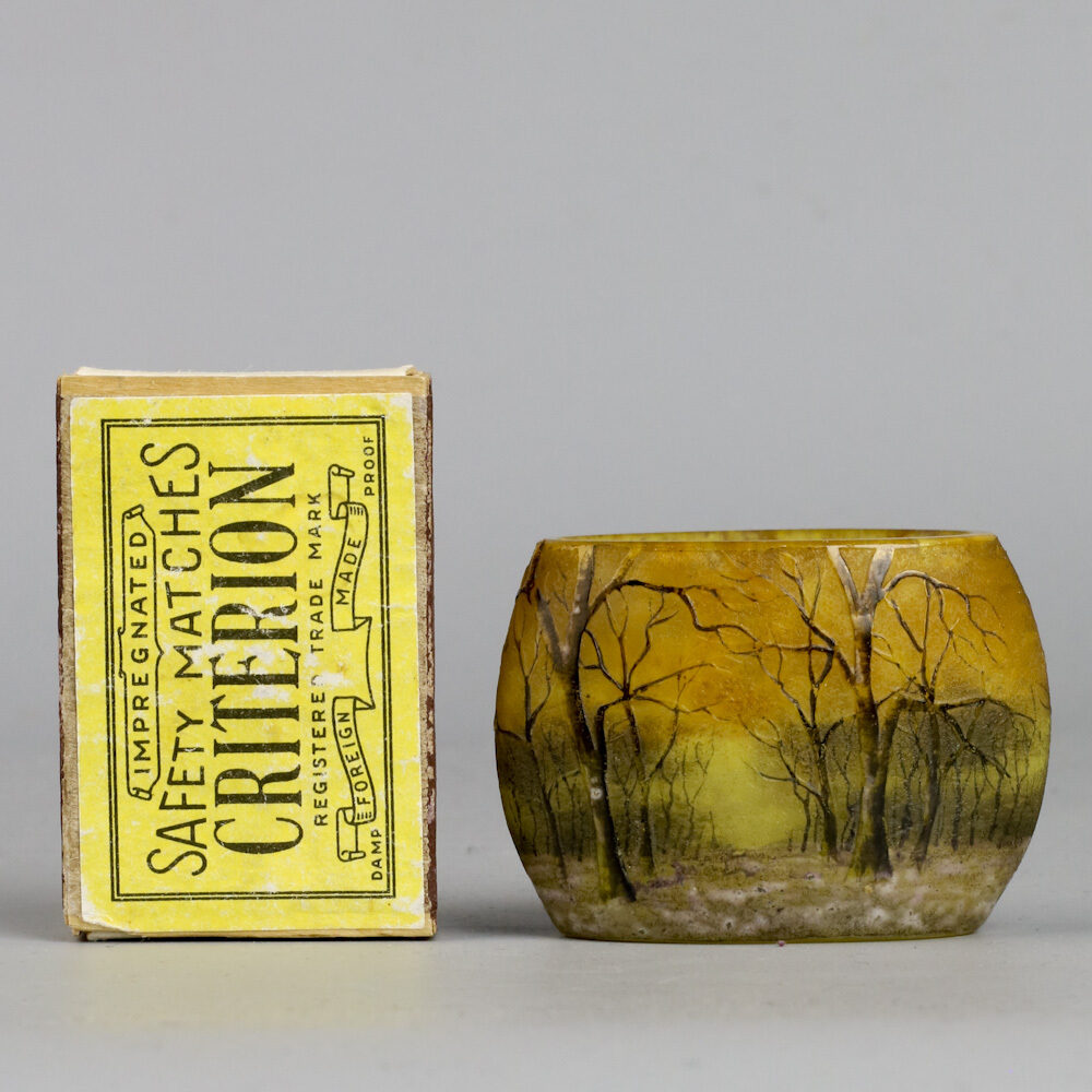 Dit soort vaasjes bevonden zich vroeger in de presentatiekoffer van een vertegenwoordiger die de voorwerpen van Daum aldus aan de betreffende winkeliers liet zien.