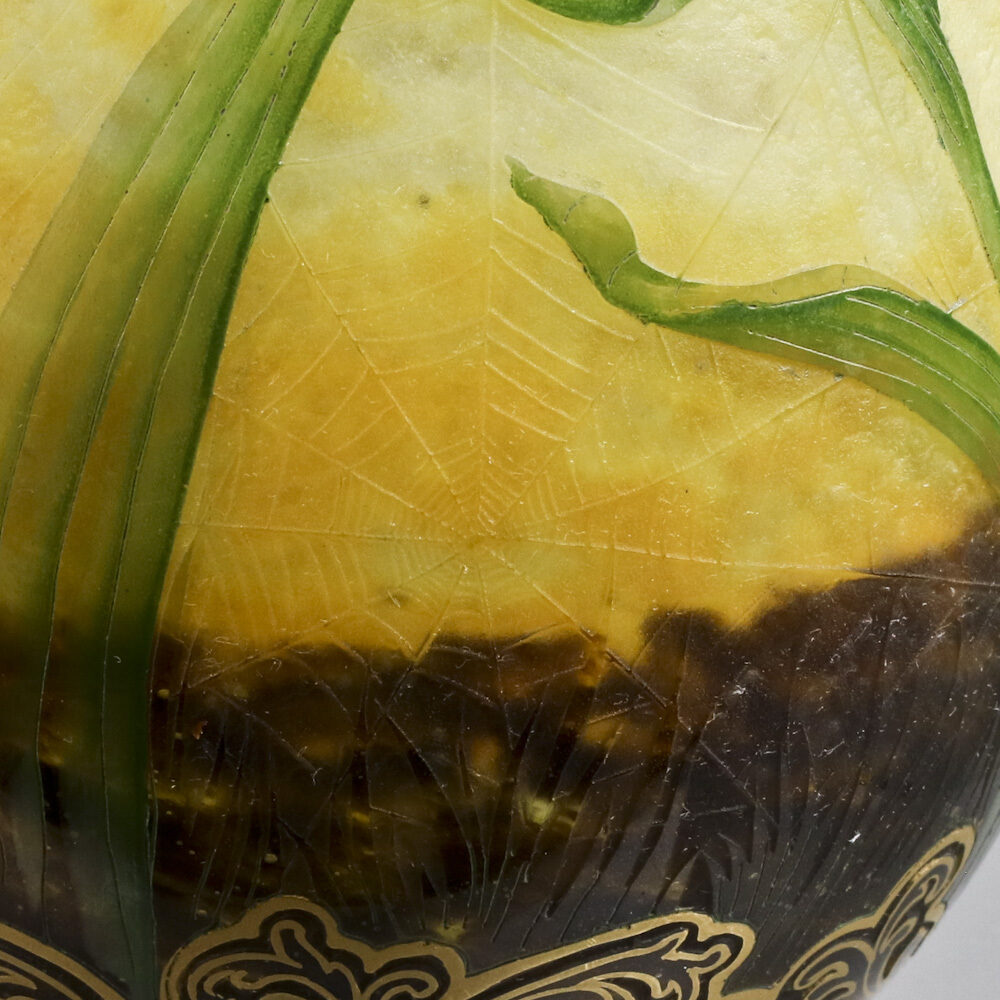 Geëtste en goudgeëmailleerde bladmotieven aan de onderkant van de vaas.
