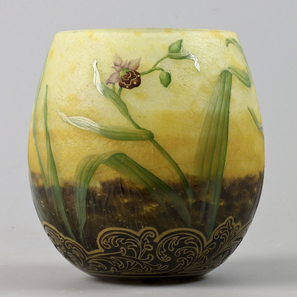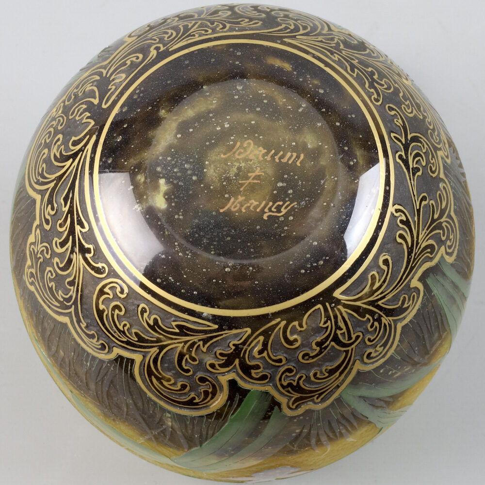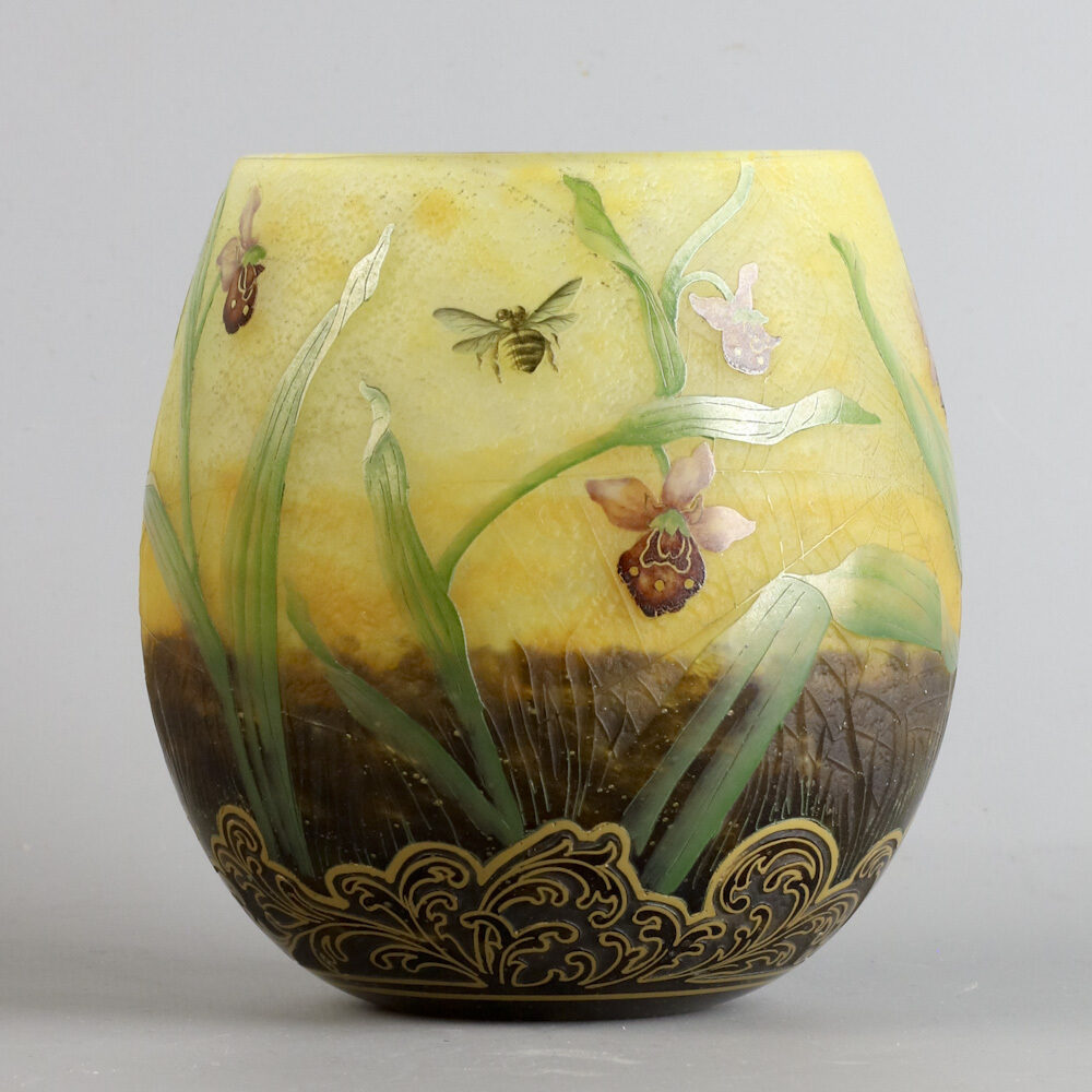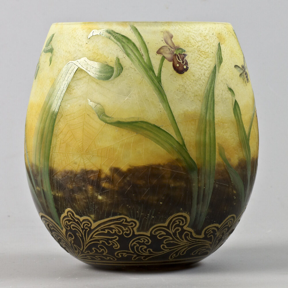 Bol bekervormig glazen vaasje gemaakt bij Daum, Nancy met geëtst en geëmailleerd decor van Leeuwenbekjes (Gueule de Lion), een vlieg en geëtste spinnenwebben, naar een ontwerp van Bergé rond 1900.