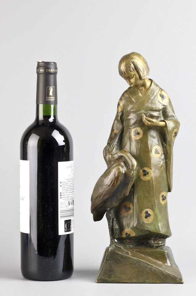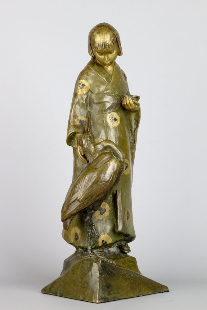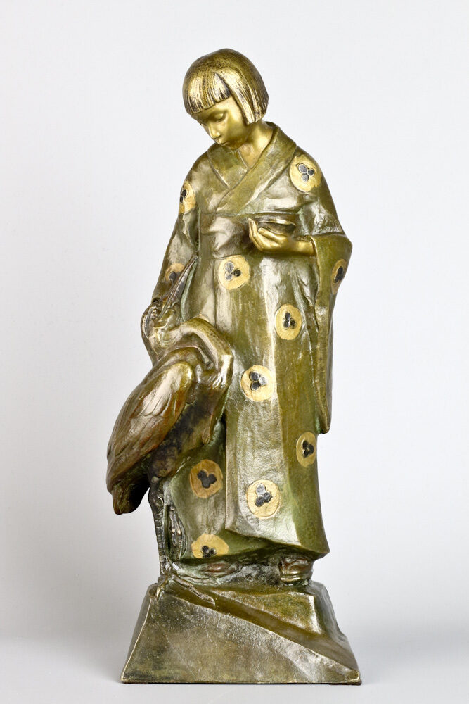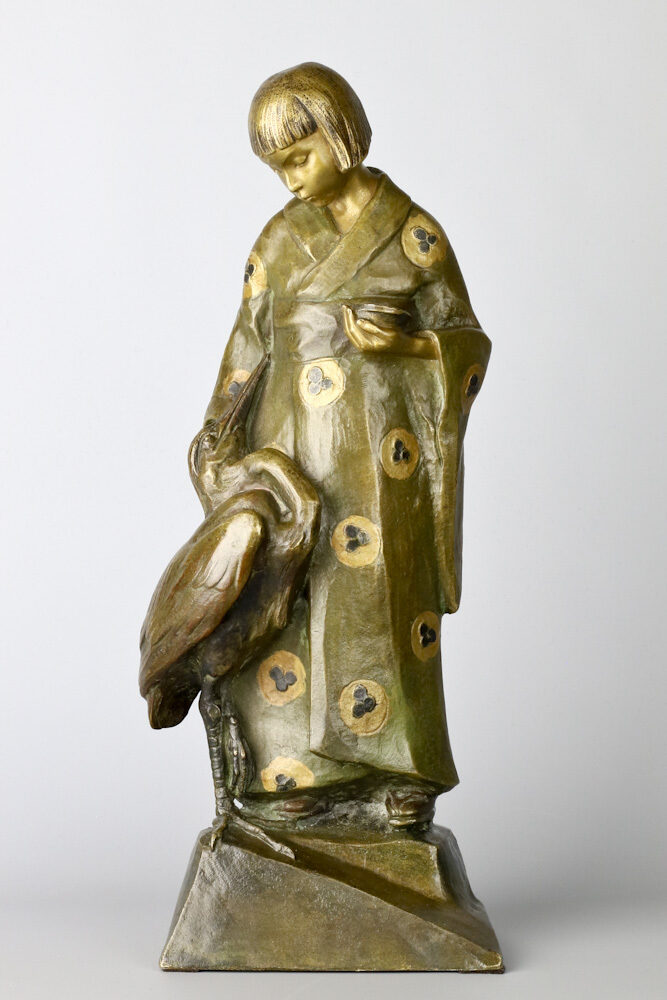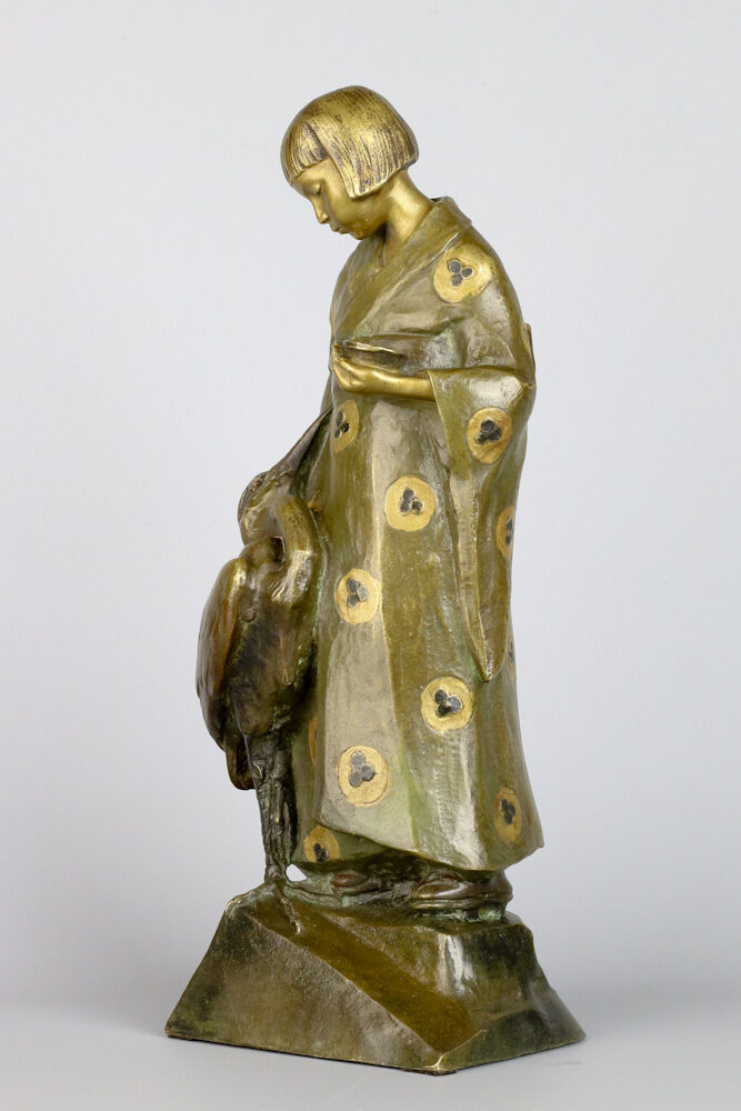 Ontroerend bronzen figuur van een Japans meisje met haar vriendje de reiger aan haar zijde, in een met rozetten bedrukte kimono en staand op Geta, de typerende Japanse houten schoentjes ook wel Kanji genoemd.