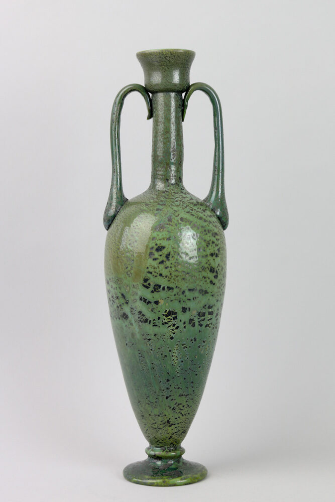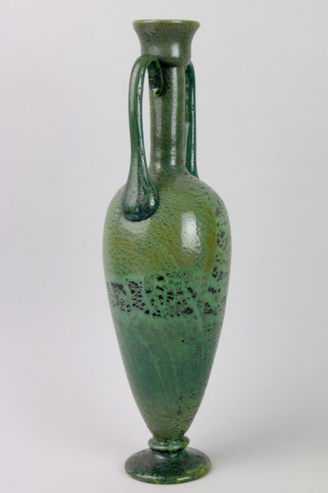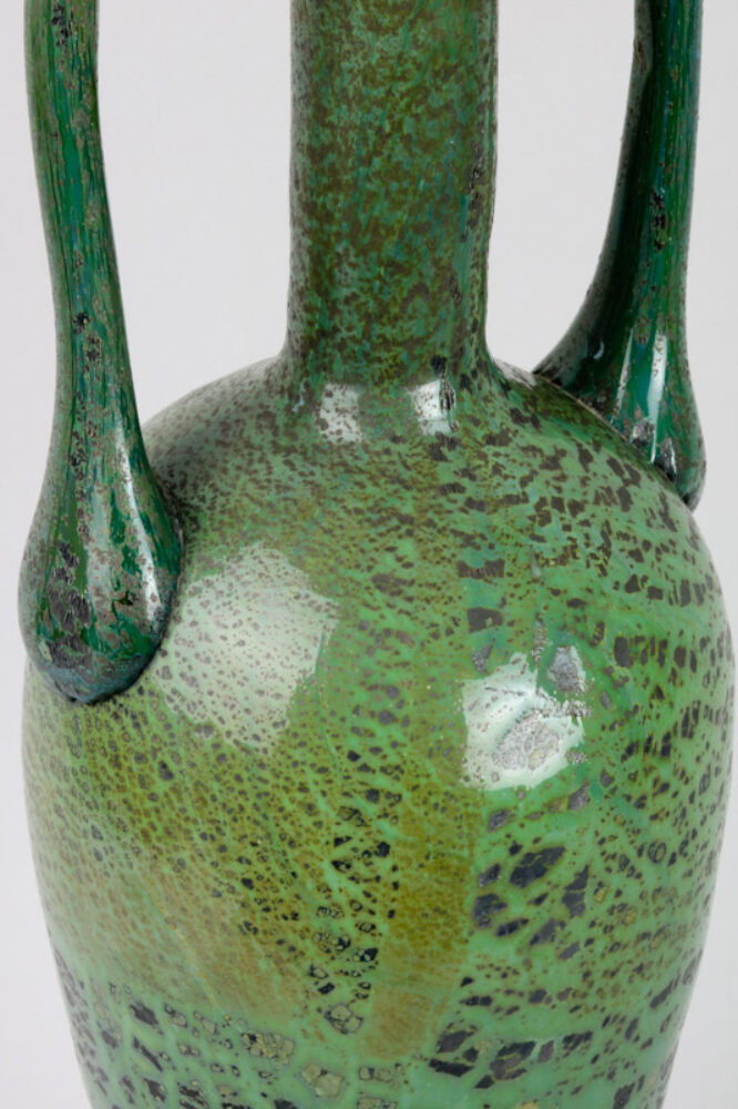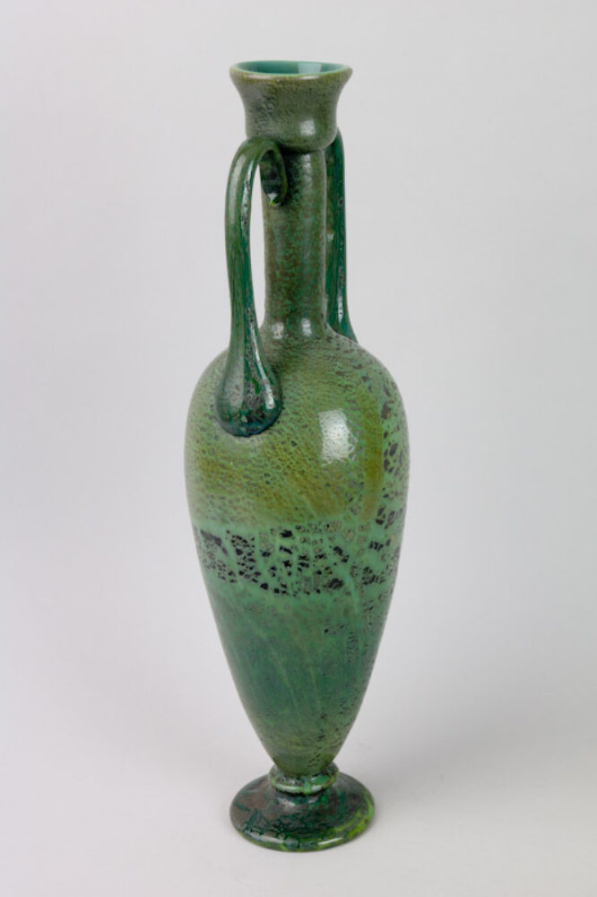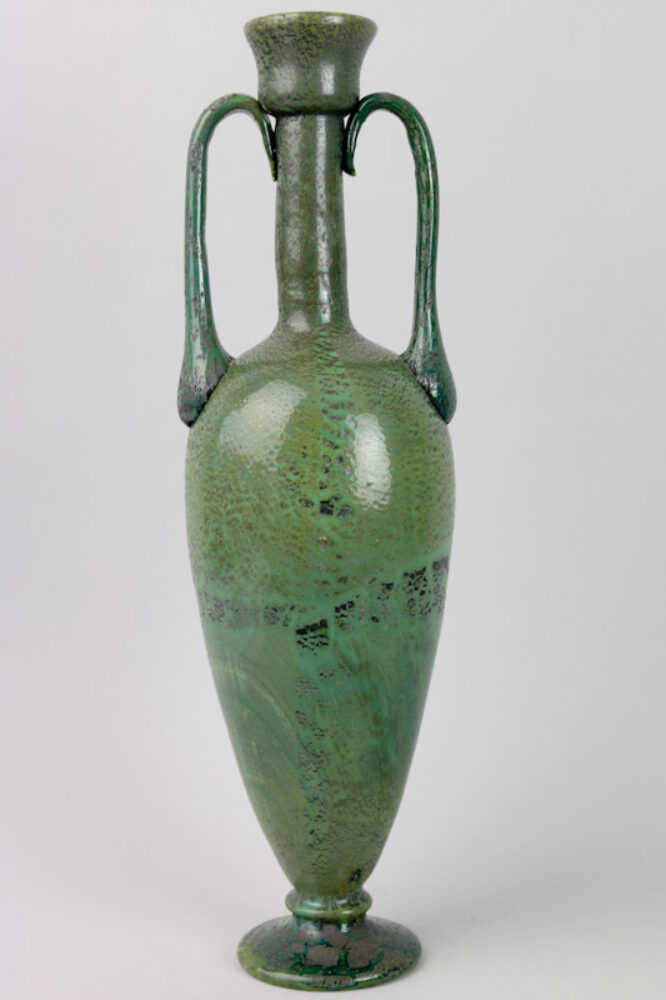 Amforavormige vaas in chalcedoon glas met een opgesmolten en door uitblazen opengebarsten laag metaaloxide gemaakt bij Salviati & Co, Murano in ca. 1890.
