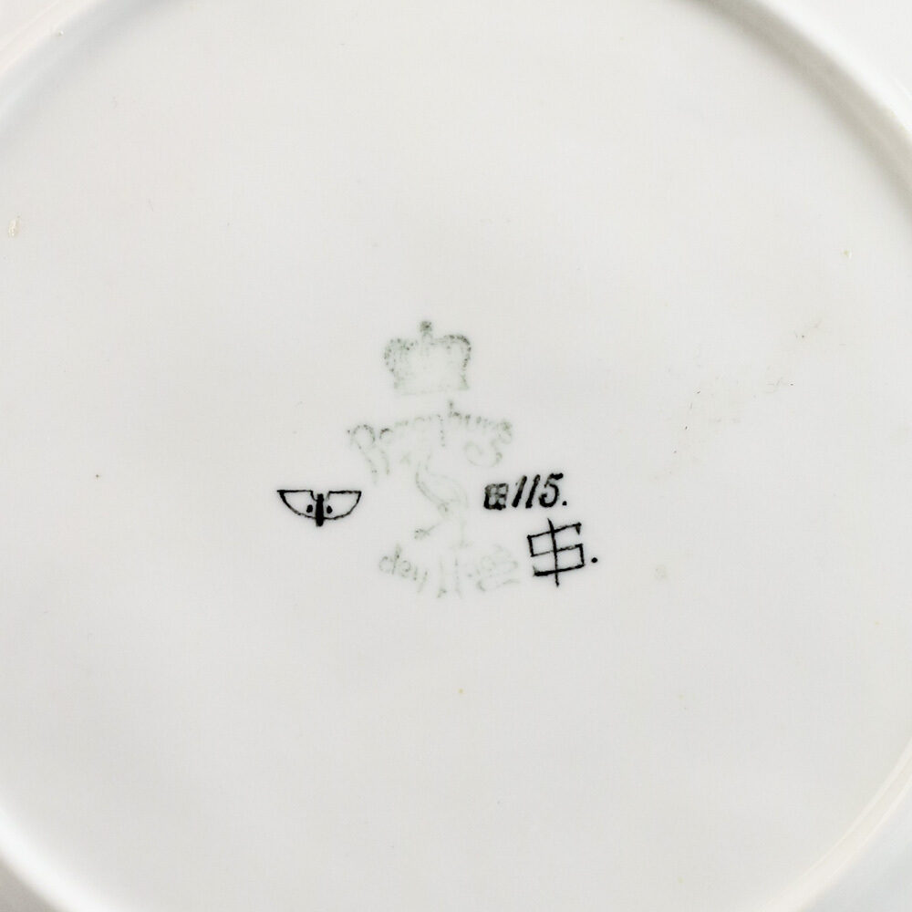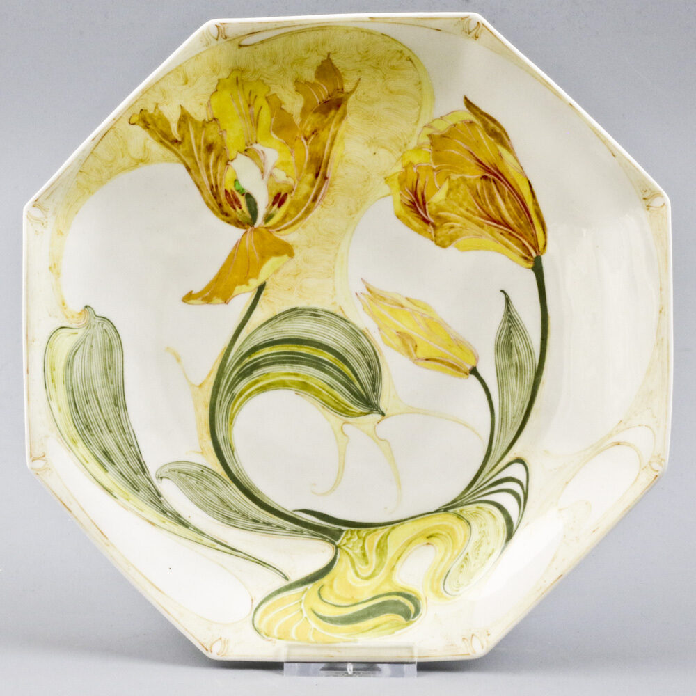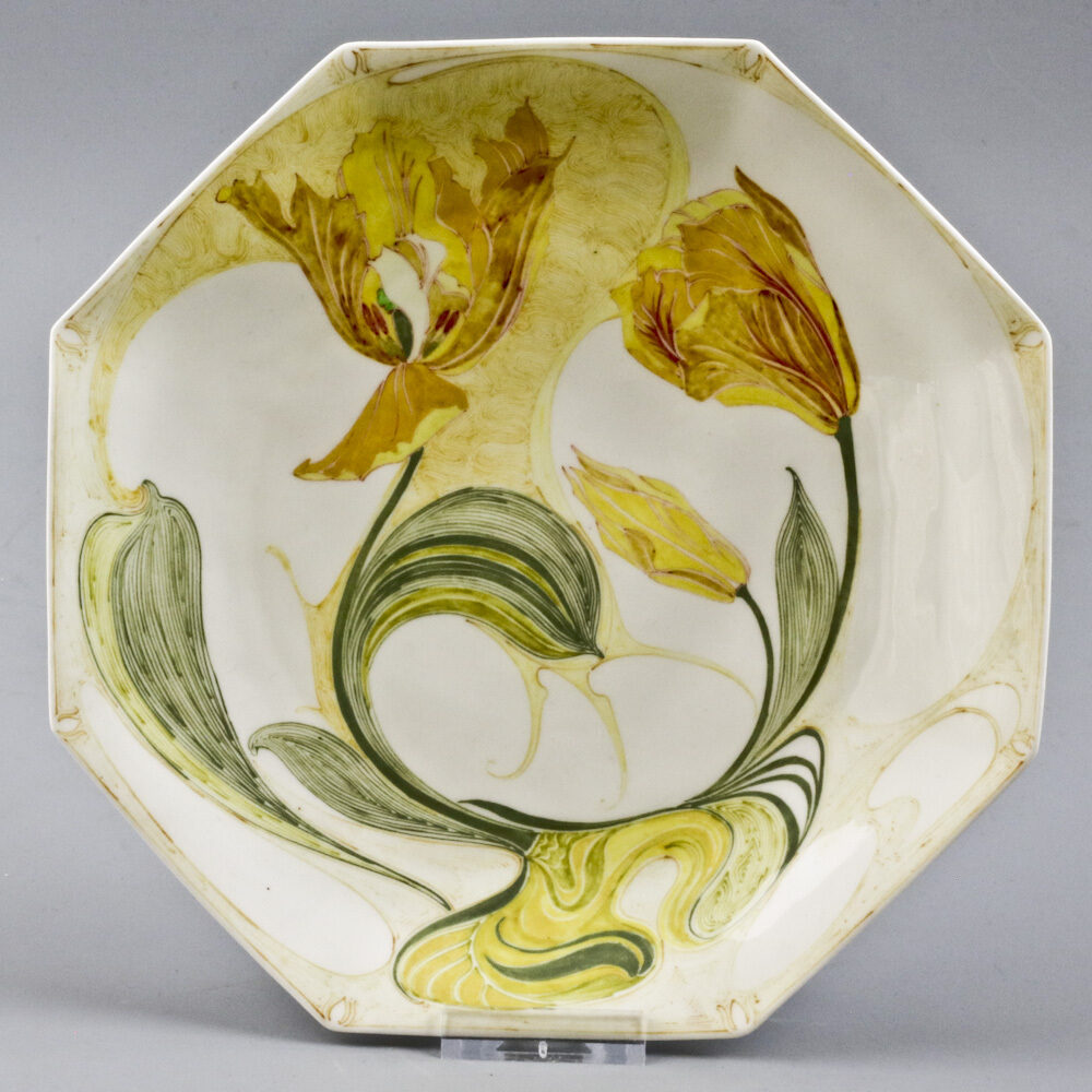 Rozenburg bord van eierschaalporselein met decor van tulpen in uitbundige Jugendstil vormen met jaarletter 1906 en geschilderd door Sam Schellink.
