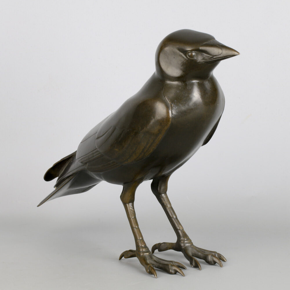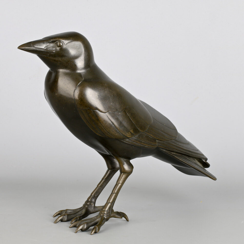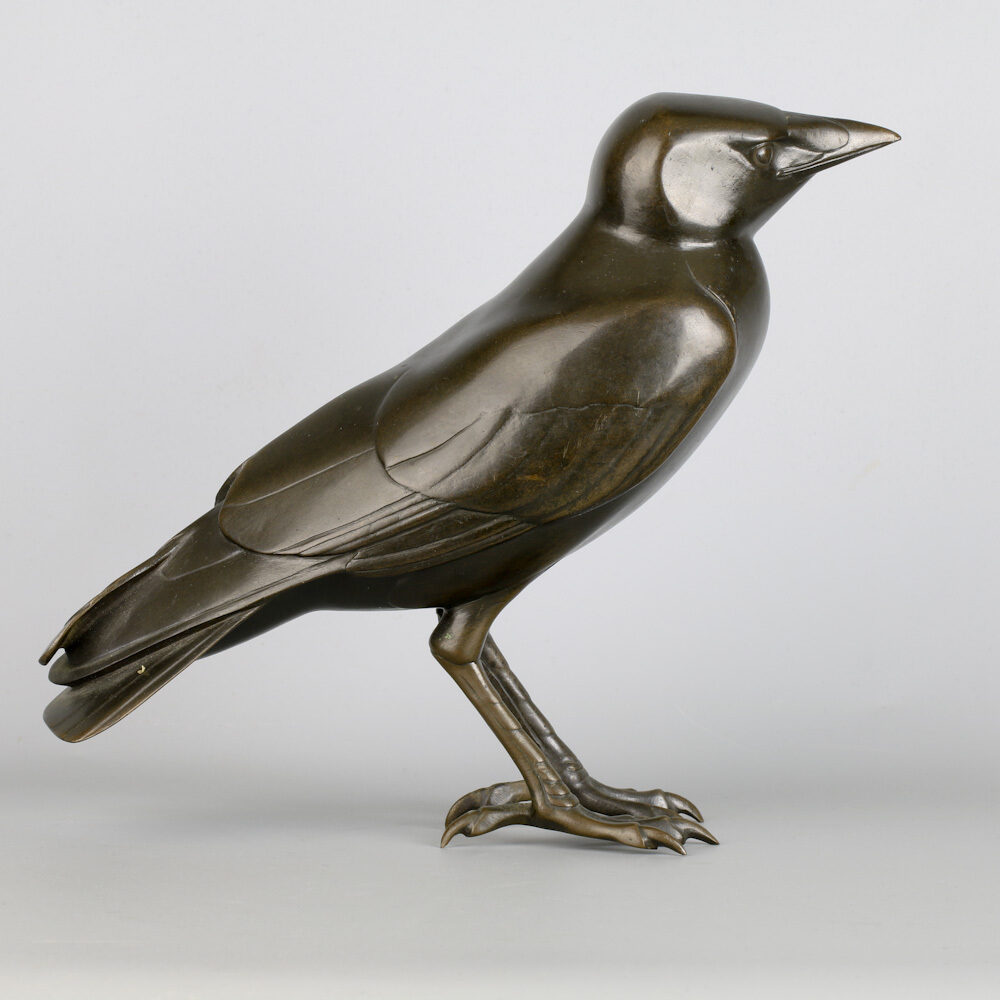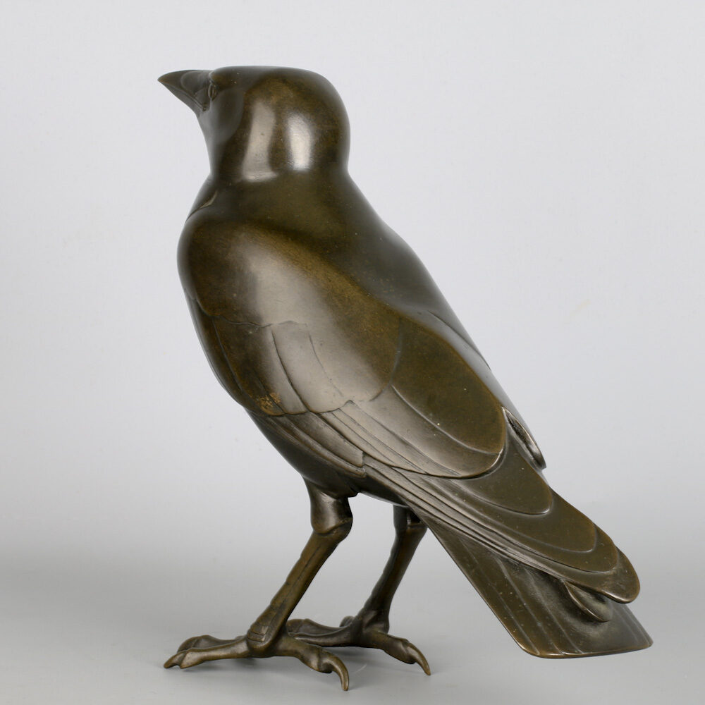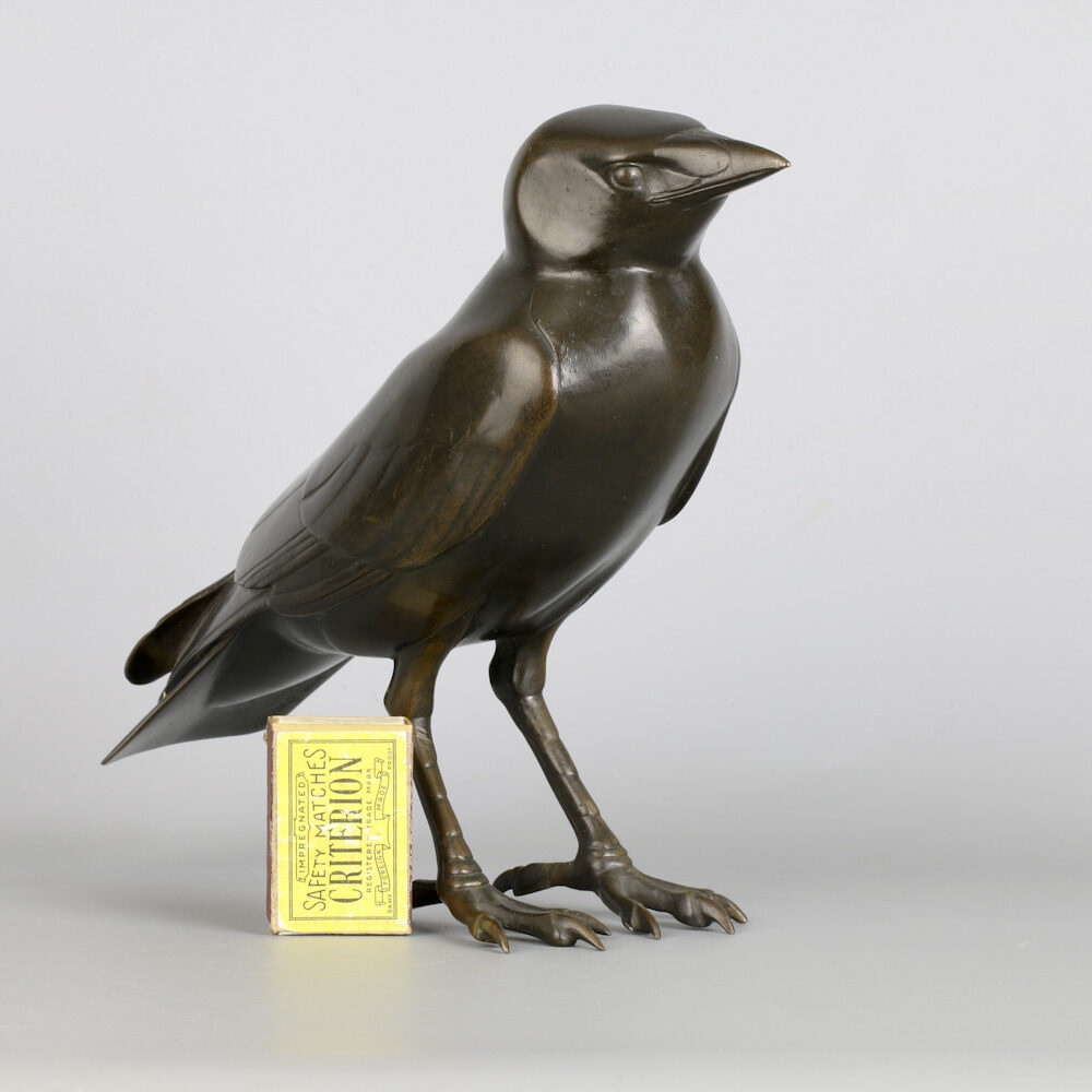 Bronzen figuur van een torenkraai (kauw) door Wilhelm Krieger 1920, gegoten bij Lauchhammer Bildguss.