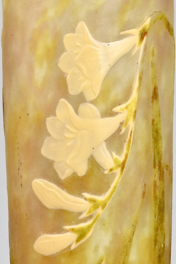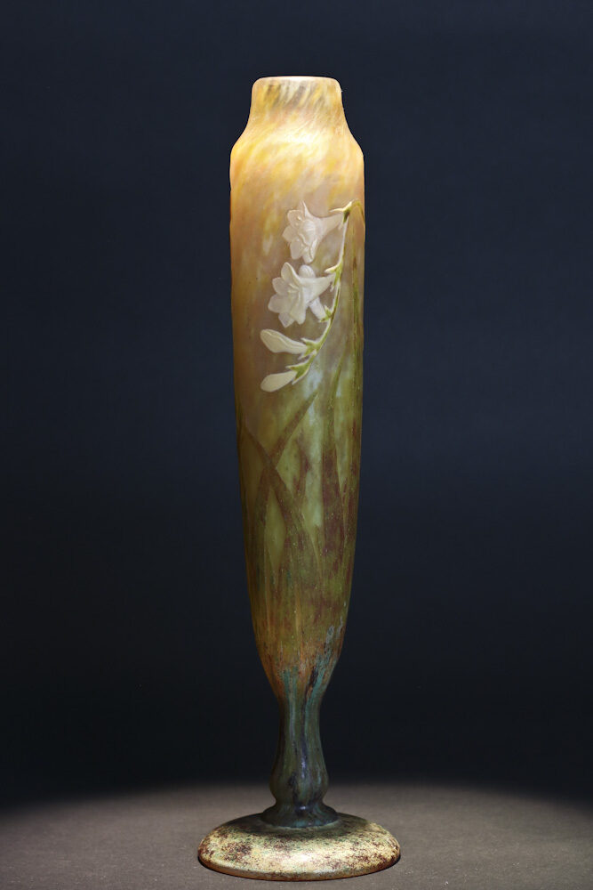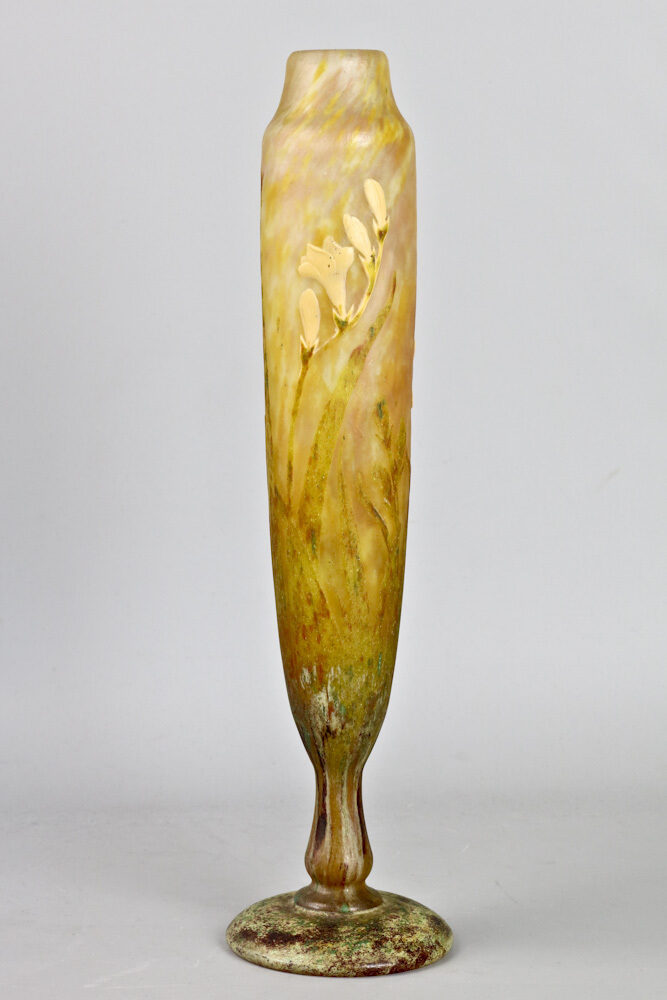 Elegant, slender multi-layered vase with etched, applied and wheel-cut (marquetry) Freesia decorations, made by Daum, Nancy, circa 1905.